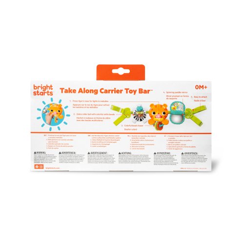Hračka do kočárku je vhodná pro děti od narození. Nos tygra se rozsvítí a zahraje 4 melodie, když ho dítě stlačí, zebra se otáčí kolem dokola a uvnitř ní chrastí barevné korálky a v otočném zrcátku se může dítě samo vidět.Hračku lze snadno uchytit na většinu kočárků nebo autosedaček.