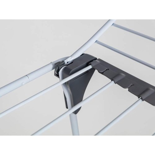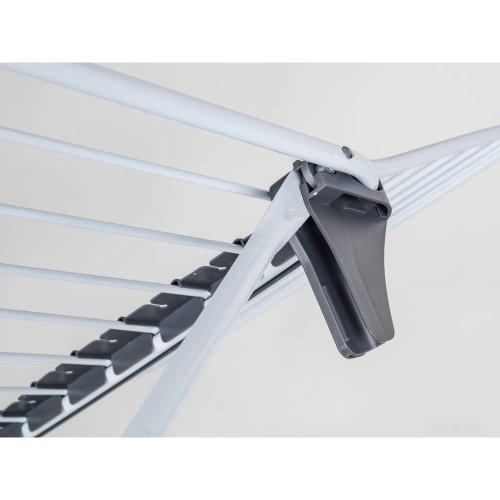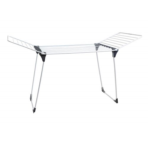 Stabilní přenosný sušák na prádlo nabízí cca 20 metrů sušící plochy, což představuje až dvě plné pračky prádla. Boční křídla jsou vhodná na sušení delšího prádla. Praktickým pomocníkem je držák na sušení ponožek. Velkou výhodou je stabilní konstrukce z bílých trubek, doplněných plastovými držáky v šedé barvě. Bezpečnému použití napomáhá také plastové zpevnění nohou, omezující možnost nechtěného složení a případného pádu. Výhodou je pár koleček umožňující rychlý posun sušáku.