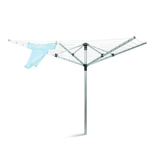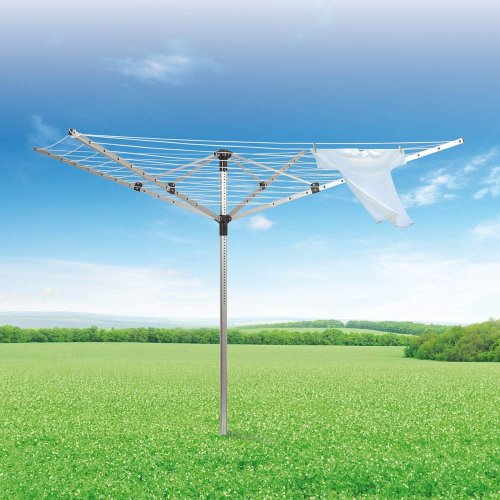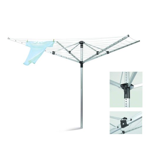 Venkovní sušák 50 m, 4 ramena, který jistě oceníte v letních měsících, kdy můžete sušák umístit kdekoliv na vaší zahradu. Do země se upeňuje pomocí zemní objímky, která je součástí balení. Rozměry 173 x 173 x 187 cm.