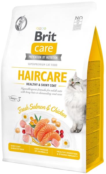 BRIT CARE CAT GRAIN-FREE HAIRCARE. HEALTHY & SHINY COAT. HYPOALERGENNÍ RECEPTURA "ČERSTVÝ LOSOS & KUŘE".