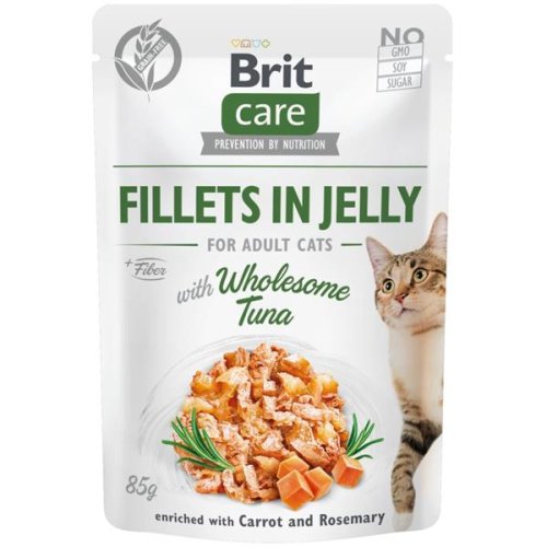 Filetky Brit Care Cat obsahují masové kousky v želé. Masové kousky jsou obohaceny o mrkev a rozmarýn. Kompletní superprémiové krmivo je speciálně vyvinuto pro dospělé kočky a je bezobilné. Kočičí jídelníček by měl být pestrý, chutný a zdraví prospěšný. Lahodná kapsička Brit Care Wholesome Tuna obsahuje maso z tuňáka (8 %) a kuřete (62 %). Je vhodná jako kompletní krmivo nebo jako doplněk k suchému krmivu (zvýšení rozmanitosti a chuti stravy). Filetované kousky v jemném želé jsou ideální zejména pro velmi vybíravé kočky nebo kočky s problematickým příjmem krmiva. Díky přidaným složkám (mrkev, rozmarýn) podporuje krmivo zdravé trávení.