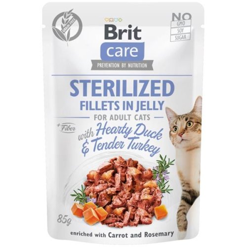 Filetky Brit Care Cat obsahují masové kousky v želé. Masové kousky jsou obohaceny o mrkev a rozmarýn. Kompletní superprémiové krmivo je speciálně vyvinuto pro dospělé kočky a je bezobilné. Receptura Duck & Turkey je ideální pro kastrované nebo sterilizované kočky. Kočičí jídelníček by měl být pestrý, chutný a zdraví prospěšný. Lahodná kapsička Brit Care Duck & Turkey obsahuje maso z kachny (4 %), krocana (4 %) a kuřete (62 %). Navíc obsahuje játra (15 %). Je vhodná jako kompletní krmivo nebo jako doplněk k suchému krmivu (zvýšení rozmanitosti a chuti stravy). Filetované kousky v jemném želé jsou ideální zejména pro velmi vybíravé kočky nebo kočky s problematickým příjmem krmiva. Díky přidaným složkám (mrkev, rozmarýn) podporuje krmivo zdravé trávení.
