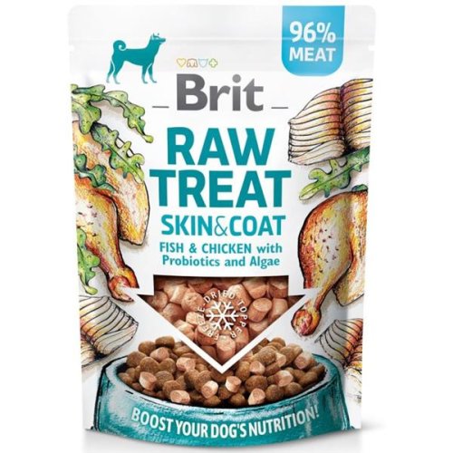 Složení: čerstvé kuřecí odřezky (54 %), odřezky z čerstvých ryb (26 %), čerstvá vepřová játra (16 %), lignocelulóza (2 %), sušená řasa Ascophyllum nodosum (1 %), hrachová mouka, inaktivované bakterie a jejich části (Lactobacillus helveticus HA – 122, 15 × 109 buněk/kg). Analytické složky: hrubý protein 40 %, hrubé oleje a tuky 38 %, hrubá vláknina 2,5 %, hrubý popel 12 %, vlhkost 4 %, vápník 4 %, fosfor 3 %, sodík 3 %. Obsahuje přírodní antioxidanty: tokoferolové extrakty z rostlinných olejů (1b306(i)), askorbyl palmitát (1b304), výtažek z rozmarýnu. Obsahuje konzervační látky schválené EU: kyselina citronová (1a330). Metabolizovatelná energie: 4 930 kcal/kg Krmný návod: Denní dávka pro psy malých plemen (1–10 kg) – 2 polévkové lžíce/5 g denně. Denní dávka pro psy středních plemen (10–25 kg) – 2–4 polévkové lžíce/5-10 g denně. Denní dávka pro psy velkých plemen (25–50 kg) – < 4 polévkové lžíce/< 10 g denně. Podávejte denně se suchým krmivem ke zvýraznění chuti nebo jako pamlsek. Lyofilizovaný RAW TREAT je určený jako doplněk stravy a nemá nahrazovat kompletní a vyváženou stravu. Nutriční hodnota 100 g lyofilizovaného výrobku odpovídá 300 g čerstvého syrového masa. Vždy svému psímu parťákovi zajistěte dostatek čerstvé pitné vody.