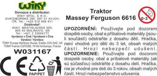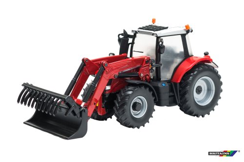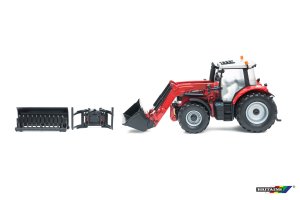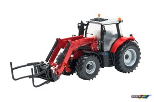 Britains Model traktor s čelním nakladačem Massey Ferguson 6616. Měřítko 1:32. Velikost 21,5 cm. Kovový s plastovými díly, volná kola. Pohyblivá radlice. Balení obsahuje 3 typy vyměnitelných nakládacích nástavců.