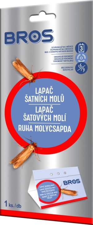 Lapač bez zápachu proti šatním molům ve skříních a zásuvkách. Lepící páska obsahuje feromon, který přirozeně vábí a účinně chytá dospělé šatní moly, a to až po dobu 3 měsíců. Neobsahuje chemické insekticidy. Balení 1 ks.