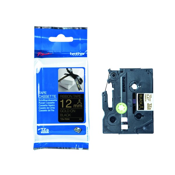 Originální pásková kazeta Brother TZe-R334 - zlatý tisk na černé, šířka 12 mm