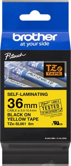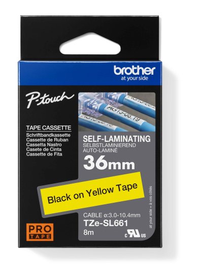 36 mm široká SAMOLAMINOVACÍ páska žlutá / černý tisk, vhodná pro značení optických, síťových a jiných elektro kabelů v rozmezí 3,0-10,4 mm jejich průměru.
