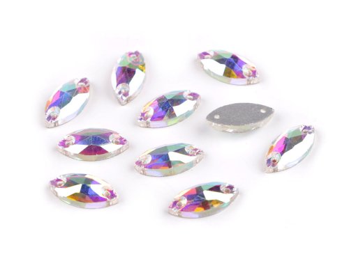 Skleněné kamínky ve tvaru navety mají precizní výbrus, díky kterému se efektně třpytí. V každém kamínku jsou dva otvory, které umožňují snadné našívání. [Na rubové straně jsou opatřeny krycí barvou, která zabraňuje zbarvení dle přiloženého podkladu.] Oceníte je při výrobě šitých šperků nebo zdobení oděvů. Kamínky oslnivě vyniknou na společenských šatech, halenkách a doplňcích, jako jsou kabelky, psaníčka, klobouky apod.