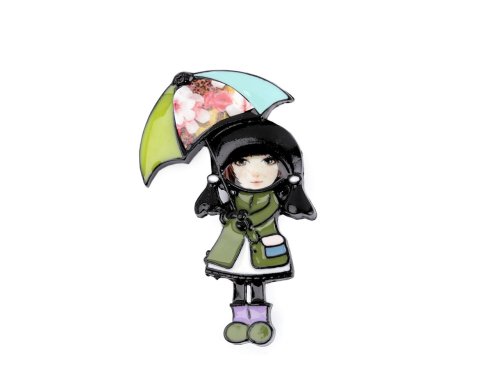 Brož holčičky s deštníkem je ozdobená barevným smaltem. Tento hravý kousek můžete využít na běžné nošení, je oblíbená i u dětí a slečen školou povinných. Můžete ji nosit na oděvech, kloboucích, taškách či s ní můžete ozdobně sepnout šátek. Na zadní straně má brožový špendlík. Brož je na plastové kartě, kterou lze zavěsit na prodejní stojany.