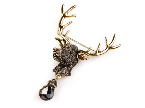 Elegantní brož s jelení hlavou a broušeným kamenem zaujme na první pohled. Je osázená broušenými kamínky, poutavě se leskne. Skvěle dozdobí saka, svetry, kabelky či čepice. Hodí se i na ozdobné sepnutí šátku. Brož má vzadu brožový špendlík. Je na plastové kartě, která se dá zavěsit na prodejní stojany.