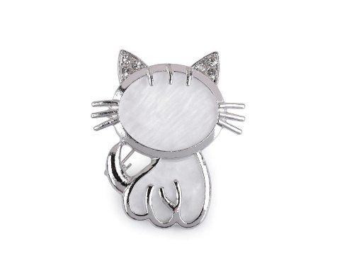 Brož ve tvaru kočky je ideálním dárkem pro ženu či dívku, která tato domácí zvířata zbožňuje. Tělo má ozdobené imitací perleti, uši má osázené drobnými broušenými kamínky, které se krásně třpytí. Zapíná se pomocí brožového špendlíku. Brož můžete nosit nejen na oděvech, ale hodí se i k ozdobení klobouků, tašky či sepnutí šátku. Je na plastové kartě, která se dá zavěsit na prodejní stojan.