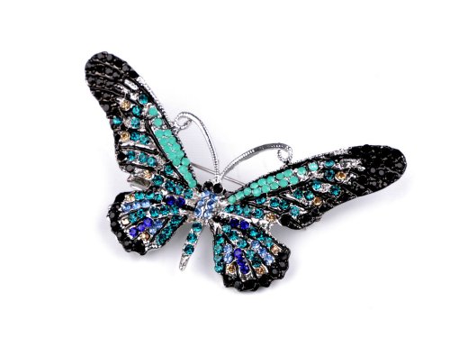 Elegantní brož ve tvaru motýla je nepřehlédnutelná. Je osázená drobnými broušenými kamínky, které se krásně třpytí. Zapíná se pomocí spínacího špendlíku, který má pojistku proti nechtěnému otevření. Na zadní straně je i klips se zoubky, který využijete např. na klopě, která je z materiálu, jenž nechcete propíchnout. Brož můžete nosit nejen na oděvech, ale hodí se i k ozdobení klobouků, tašky či sepnutí šátku. Brož je na kartě, která se dá zavěsit na prodejní stojany.