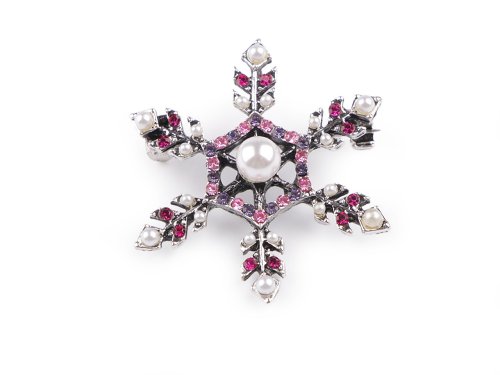 Brož sněhová vločka je osázená broušenými kamínky s efektním třpytem. Její elegance vynikne na zimní čepici, svetru, šatech i halence. Můžete ji nosit na oděvech, kloboucích, taškách či s ní můžete sepnout šálu. Na zadní straně má brožový špendlík. Brož je na kartě, kterou lze zavěsit na prodejní stojany. Brož č.1 je dozdobená plastovými perlami.