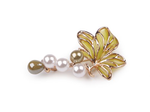 Brož s elegantním hroznem bude perfektním doplňkem vašeho oděvu. Díky perlám a barevnému smaltu skvěle dozdobí halenky, šaty, saka, svetry, kabáty, kabelky či čepice. Hodí se i na ozdobné sepnutí šátku. Brož má vzadu brožový špendlík. Je na plastové kartě, která se dá zavěsit na prodejní stojany.