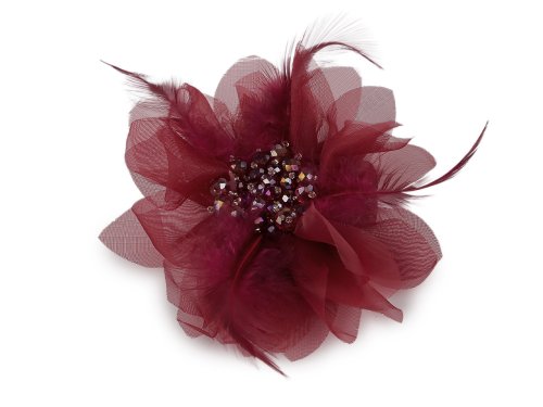 Brož se skleněnými broušenými korálky a peřím - bordó