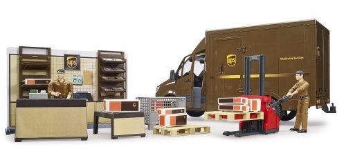 Zásilkovna UPS od společnosti BRUDER s vybavením a figurkou. Můžete vyzvednout a odevzdat zásilky, zakoupit přepravní boxy a využít další služby. Zaměstnanec zahrnutý v sadě rád pomůže. Jako doplňky se nabízí vozidla UPS. Vyrobeno v Německu, z kvalitních materiálů. Hlavní vlastnosti: figurka zaměstance1 oboustranně potištěná stěna zásilkovny2 policové díly, stolek s pokladnou, váha, koš na balíky, 4 balíkyvyrobeno v Německu