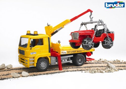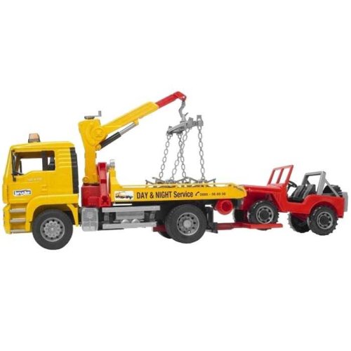 Bruder Nákladní auto MAN odtah + JeepOdtahová služba + Jeep je odtahový vůz včetně jeepu. Odtahový vůz MAN TGA má sklápěcí kabinu, je možné nahlédnout na blok motoru a přední sklo vyrobené z vysoce odolného nerozbitného polykarbonátu. Za kabinou je umístěna funčkní otočná manipulační ruka, která se nechá vysunout a její součástí jsou řetězy s úchytnými segmenty pro snadnou manipulaci s jeepem. Nástavba má podkladové klíny a výklopné opěry pro 100% stabilitu plně naloženého odtahového vozu. Terénní Jeep má otvíratelnou kapotu motoru, přední čelo se dá sklopit a má velmi jednoduché osové řízení. Na odtahový vůz lze dokoupit a instalovat světelný a zvukový maják (BR2801) a též přední radlici (BR2775). Vyrobeno v Německu, z kvalitních materiálů. Hlavní vlastnosti: nákladní auto s Jeepemsklápěcí kabinaotevíratelná kapota motorusklopné přední čelootočná manipulační rukavyrobeno v Německu