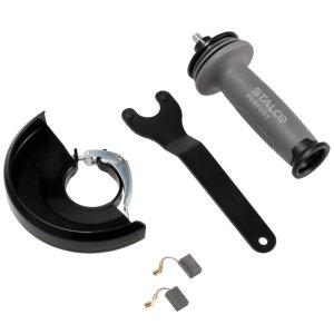• příslušenství: pomocná rukojeť, bezpečnostní kryt, klíč na vnější přírubu, vnitřní příruba, vnější příruba, 1× sada uhlíkových kartáčů