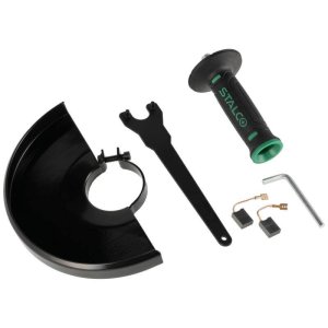 • příslušenství: pomocná rukojeť, bezpečnostní kryt, klíč na vnější přírubu, vnitřní příruba, vnější příruba, 1× sada uhlíkových kartáčů