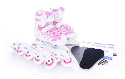 Dívčí roztahovací brusle se speciální duální konstrukcí pro celoroční rekreační bruslení. Konstrukční systém umožňuje záměnu zimních bruslí za podvozek s kolečky. Jednoduchým povolením dvou šroubů přeměníte zimní brusle na kolečkové inline brusle a naopak.