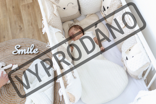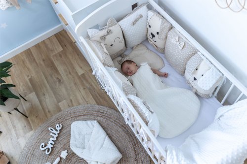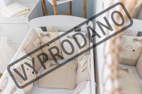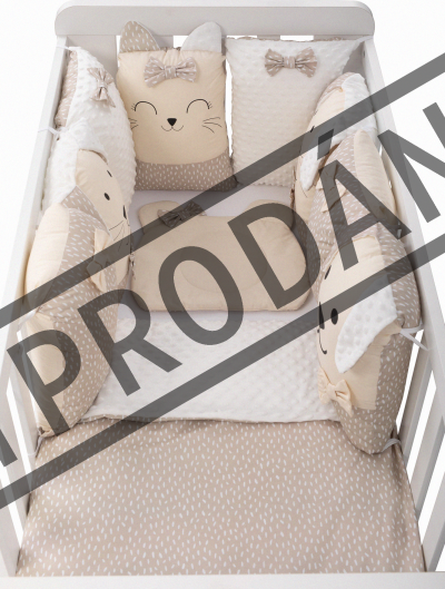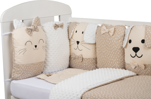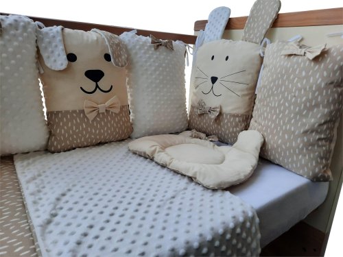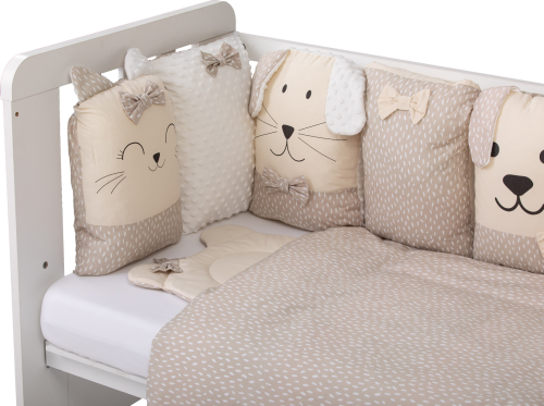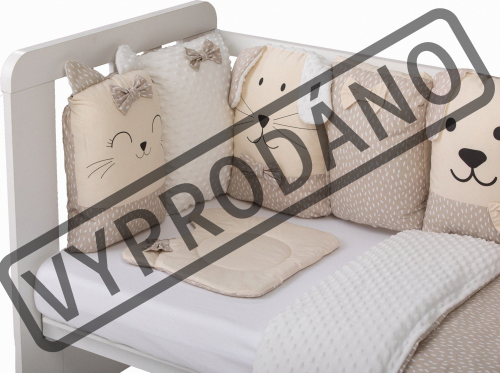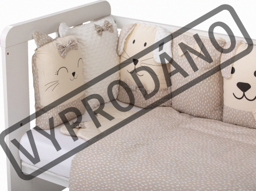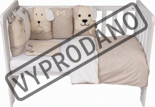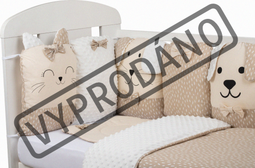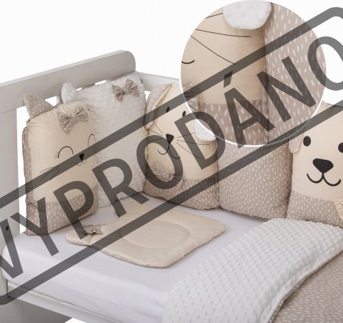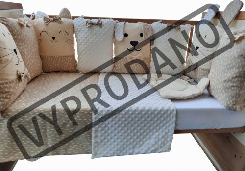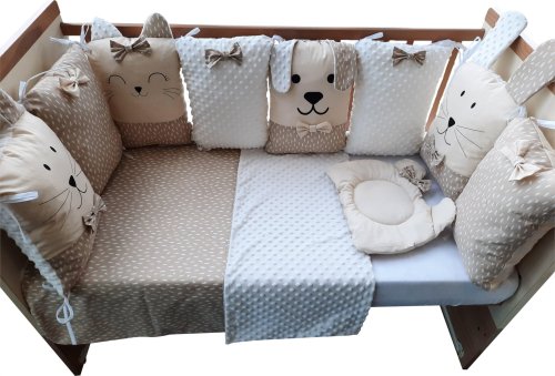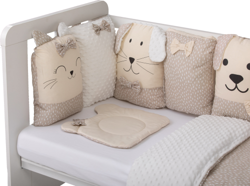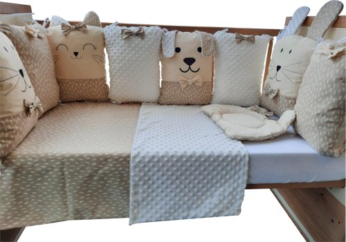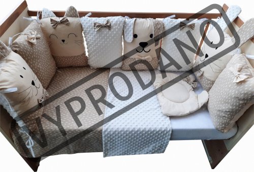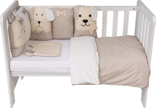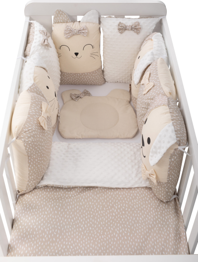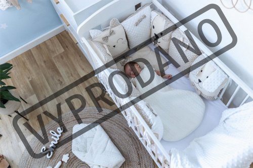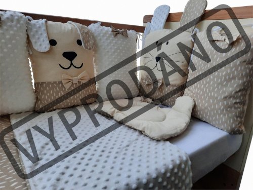 vhodné do postýlek 120x60 cm a 140x70 cm podhlavníček 35x31 cm (bavlna+minky polyester, výplň: polyester) přikrývka 115x85 cm (polyester) povlak na přikrývku se zipem 120x90 cm (bavlna+minky polyester) bavlněné prostěradlo s gumou na matrace o rozměrech 120x60 cm a 140x70 cm 8dílný mantinel o celkové délce 240 cm lze umístit podélně i svisle, lze použít samostatně jako dekoraci v dětském pokoji (4 díly: bavlna, 4 díly: bavlna+minky polyester, výplň: polyester) povlečení je oboustranné