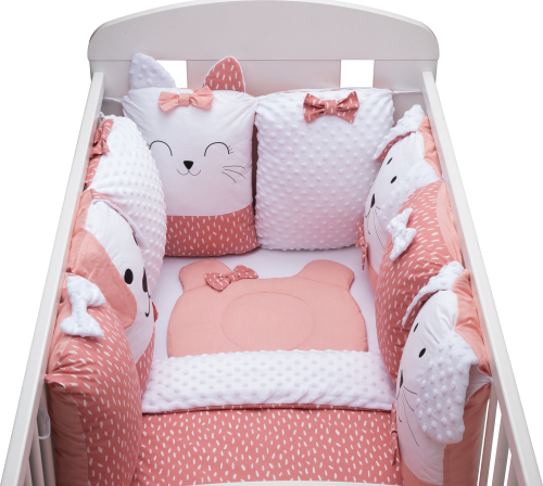 vhodné do postýlek 120x60 cm a 140x70 cm podhlavníček 35x31 cm (bavlna+minky polyester, výplň: polyester) přikrývka 115x85 cm (polyester) povlak na přikrývku se zipem 120x90 cm (bavlna+minky polyester) bavlněné prostěradlo s gumou na matrace o rozměrech 120x60 cm a 140x70 cm 8dílný mantinel o celkové délce 240 cm lze umístit podélně i svisle, lze použít samostatně jako polštářky (4 díly: bavlna, 4 díly: bavlna+minky polyester, výplň: polyester) oboustranné