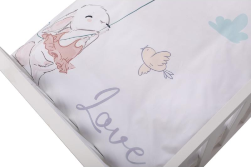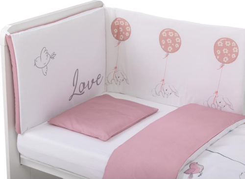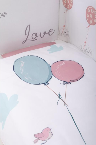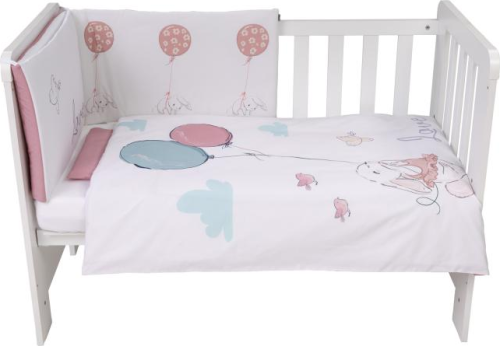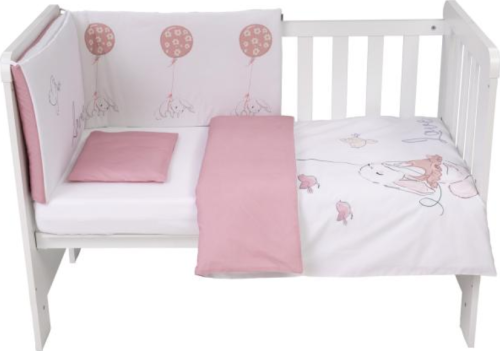 vhodné do postýlek 120x60 cm a 140x70 cm polštář 40x30 cm (výplň: polyester) povlak na polštář 40x30 cm (100% bavlna) přikrývka 120x90 cm (100% polyester) povlak na přikrývku 120x90 cm (bavlna, kombinace: polyester, viskóza, lycra) jersey prostěradlo (100% bavlna) s gumou na matrace o rozměrech 120x60 cm a 140x70 cm mantinel 200x40 cm (vnější část bavlna, kombinace: polyester, viskóza a lycra, výplň: 100% polyester) praní při max 30°C