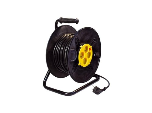 Černý prodlužovací kabel na navinovacím bubnu pro vnitřní použití. Disponuje 4 zásuvkami, tepelnou pojistkou a kabelem s průřezem 1,5 mm2. Zásuvky a zástrčka jsou vyrobeny z plastu, izolace z PVC.