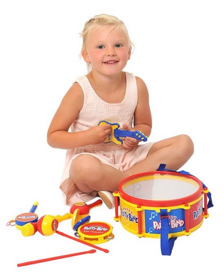Velký bubínek obsahuje další příslušenství: plastovou kytaru, mikrofon, rumba koule a další.