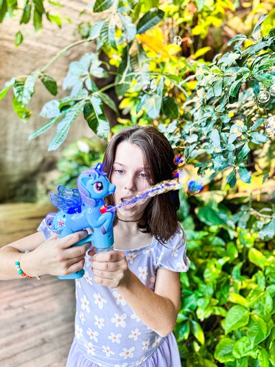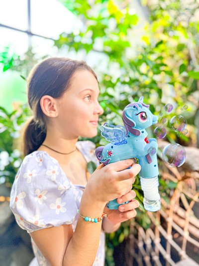 Bublifuk na baterie s jednorožcem. Pouhým zmáčknutím spouště děti vytvoří záplavu bublin. Při tvorbě bublin jednorožec hraje.