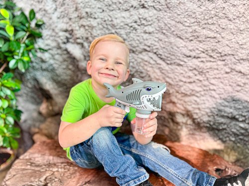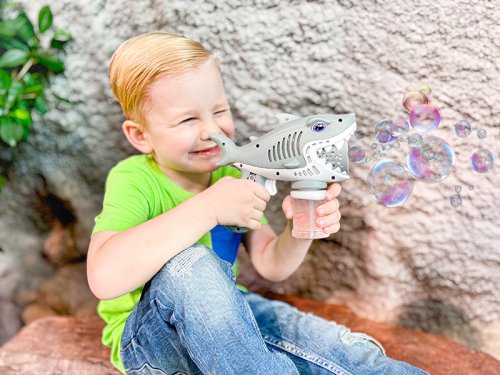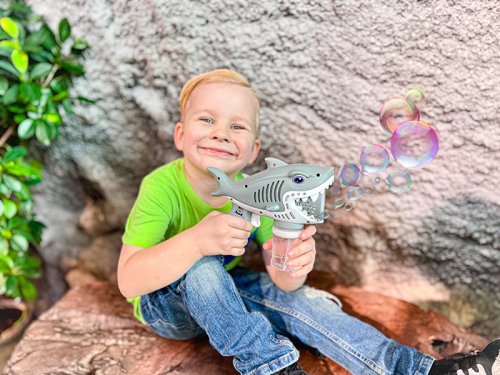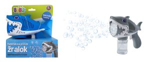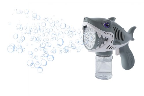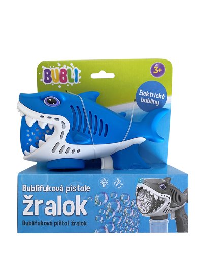 Představ si plastovou pistoli, která má tvar roztomilého, ale zároveň trochu divokého žraloka. Tělo žraloka tvoří hlavní část pistole, takže ho držíš v ruce. Jeho široká tlama je otevřená a právě z ní vylétají bubliny.