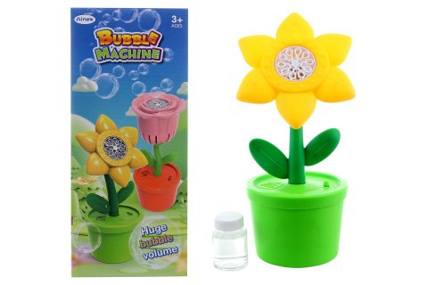 Bublifuk na baterie s motivem květiny. Napájení na 3xAA baterie - nejsou součástí balení. Návod: vložte baterie, nainstalujet náplň a zapněte tlačítkem na květináči. Materiál plast. Baleno v krabici. Rozměry balení 28x12,5x12,5 cm. Věk 3+