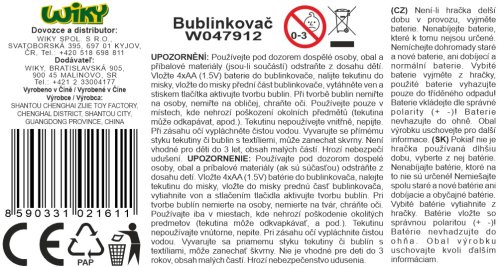 Bublinkovač s 12 tryskami. Přesné rozměry 21x9x14 cm. Baterie 4xAA nejsou součástí. 3 varianty - červená, modrá, zelená.