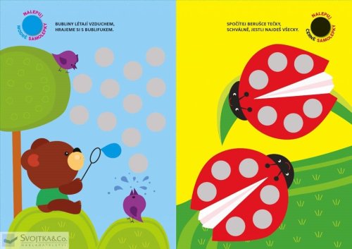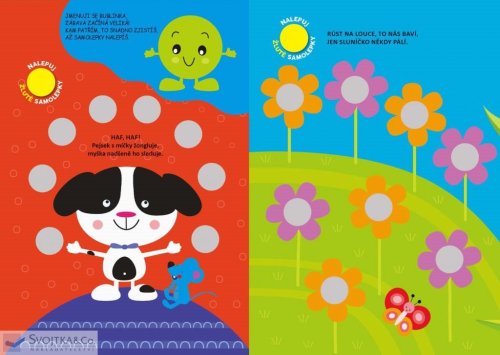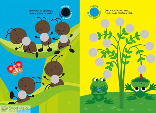 Haf, haf! Pejsek s míčky žongluje, myška nadšeně ho sleduje! Umíš nalepit míčky na správná místa? Žabka borůvky si nese, plnou náruč našla v lese. Zvládneš nalepit "borůvky" tam, kam patří? V této knížce najdou naši nejmenší plno jednoduchých aktivit a 140 samolepek, které jim pomohou naučit se jednoduše a bez námahy rozeznávat barvy. Kulaté barevné samolepky "bublinky" se lehce nalepují, krátké texty s veselými rýmy pomáhají cvičit paměť a snadno se opakují, barevné obrázky v knížce přitahují pozornost a napomáhají soustředění. Tak honem! Kam bublinky patří a jakou mají barvu?