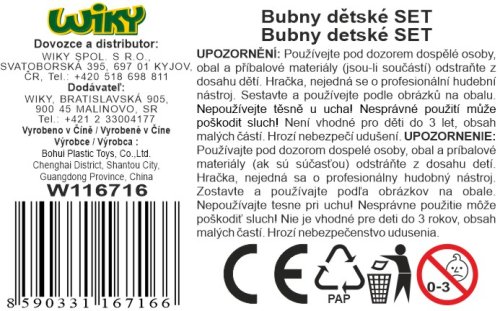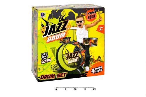 Sada trí bubnu vcetne basového kopáku s nožním pedálem a kovovým cinelem.