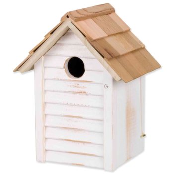 Venkovní dřevěná budka pro drobné ptactvo v bílé barvě.