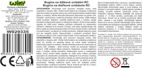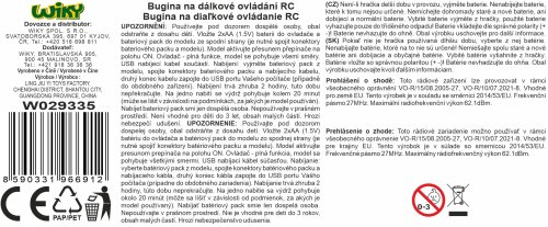 Bugina RC na dálkové ovládání. Velikost 23 cm. Bateriový pack 3.7V do buginy součástí, 2xAA do ovladače nejsou součástí. USB kabel součástí. Přepínač ON/OFF na spodní straně auta.
