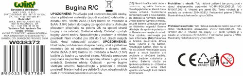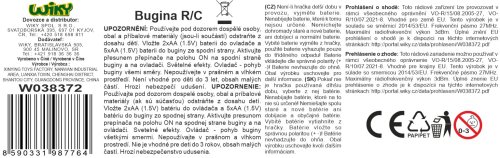Bugina RC na dálkové ovládání. Rozměry 26,3x12,5x7,5 cm. Rychlost 25 km/h. Frekvence 27 MHz. Pistolový ovladač. Světelné efekty. 5xAA baterie do auta, 2xAA do ovladače nejsou součástí. Přepínač ON/OFF na spodní straně buginy, tlačítko ON/OFF na ovladači.