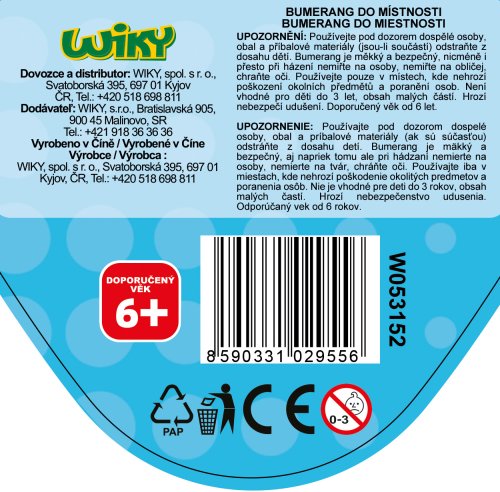 Bumerang do místnosti - český obal. Velikost 21 cm. Bumerang vhodný do interiéru. Dolet 2 až 3 metry. 4 barevné varianty - modrá, zelená, žlutá, červená.