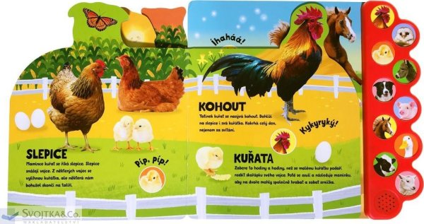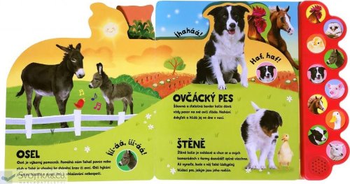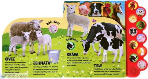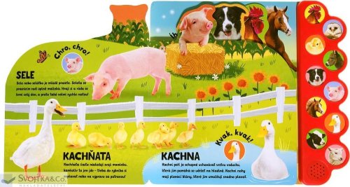 10 zvuků zvířat. Zažij život na farmě s 10 zvuky zvířat. Zvuková knížka nabízí dětem možnost poznat zvířata z farmy za pomoci zvuků. Po stisknutí tlačítka si dítě poslechne, jaké různé zvuky zvířata vydávají, a zvuk si spojí s konkrétním zvířetem. Díky tomu si zvíře lépe zapamatuje a snadno rozezná mezi ostatními. Kniha se tak stává skvělou pomůckou pro rozšiřování základní slovní zásoby a poznávání světa kolem sebe. Víš, jak dělá kohout? A rozpoznáš podle zvuku koně od osla? Nebo krávu od prasete? Stačí zmáčknout příslušný obrázek na okraji a farma doslova ožije pod tvýma rukama.