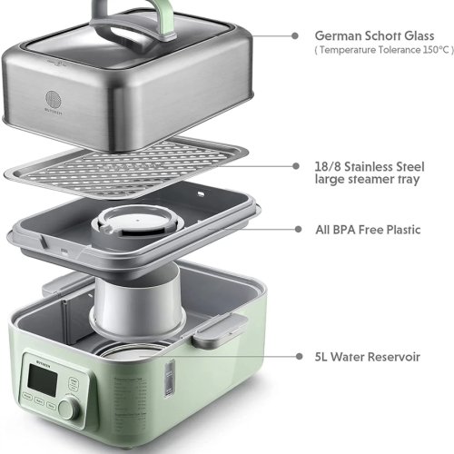 Je vyroben z potravinářské nerezové oceli a plastů bez BPA, což zajišťuje bezpečný a stabilní výkon vaření. Obsahuje dvě skleněné varné nádoby, které jsou ideální pro pomalé vaření, jako jsou polévky, jogurty a další pokrmy. Topná deska je vyrobena z vysoce kvalitní nerezové oceli pro zvýšenou účinnost a odolnost.