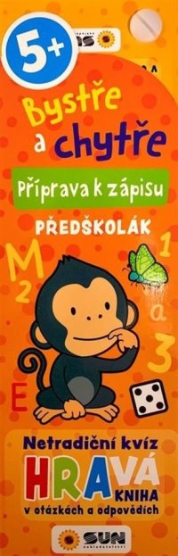 Hurá do školy zábavný kvíz! - Bystře a chytře - Příprava k zápisu - PŘEDŠKOLÁK! 5+ Tato zábavná knížka obsahuje více než 100 otázek a odpovědí, které jsou doprovázeny barevnými obrázky. Knížka je navržena tak, aby pomohla dětem od pěti let rozvíjet jejich kreativitu, znalosti o světě kolem nich, jemnou motoriku, děti jsou motivovány, aby se pokoušeli najít řešení v rámci úkolů a her. Děti se učí poznávat čísla a první počty, seznamují se s písmeny, hledají rozdíly a řeší logické úkoly a mnoho dalších zajímavých věcí prostřednictvím zábavných kvízových otázek. Kniha je vyrobena jako vějíř s otázkami na straně jedné a odpověďmi na straně druhé. Dětem je nabízena možnost vybrat si otázku podle jejich zájmu nebo podle toho, co právě zvládají. Knížka není jen zábavným kvízem, ale také pomůže dětem rozvíjet jejich kognitivní schopnosti, rozvíjí jemnou motoriku, obsahuje aktivity a hry, které podporují koordinaci rukou.