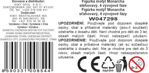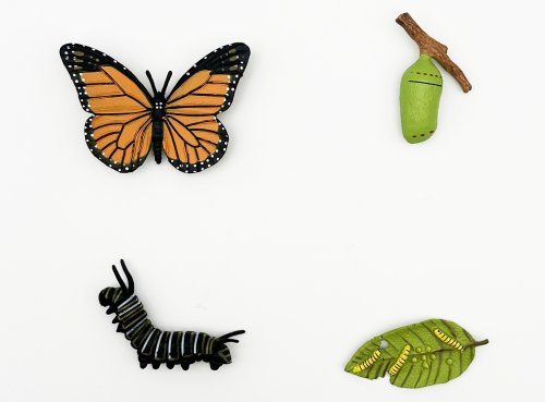 Figurka Motýl 4 vývojové fáze. Velikost 8 cm. 4 varianty - vajíčka, housenka, kokon, motýl. Vajíčka: 6,5x3,2x0,5 cm Housenka: 6,5x2x5,5 cm Kokon: 5,7x3,7x1,9 cm Motýl: 8,3x6x1 cm
