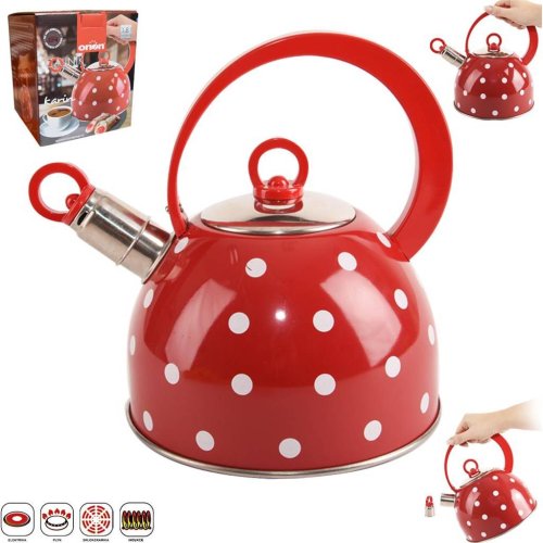 Červená konvice s bílými puntíky na vaření čaje vhodná na všechny typy sporáků.