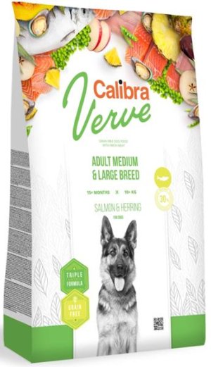 Kompletní granulované krmivo s čerstvým masem z lososa bez obilovin pro dospělé psy středních a velkých plemen s hmotností 10-90 kg. Krmivo obsahuje 30 % čerstvého masa z lososa a vysoký obsah kvalitních proteinů ze sledě. Receptura odpovídá nejvyšším požadavkům na přirozené stravování psa v souladu s jeho fyziologickými potřebami a je zárukou jeho kvalitní výživy. Čerstvé maso je vysoce výživným zdrojem bílkovin, který se vyznačuje nejen atraktivní chutí, ale je vhodné i pro citlivé zažívání. Grain free receptura je skvěle stravitelná, obsahuje kvalitní zdroje proteinu, které jsou z 75 % živočišného původu, a také adekvátní množství sacharidů a vlákniny. Je energeticky pečlivě vyvážená. Hlavní výhody Calibra Dog Adult Medium & Large Salmon & Herring: TRIPLE ACTIVE FORMULA – unikátní kombinace vybraných funkčních aditiv.