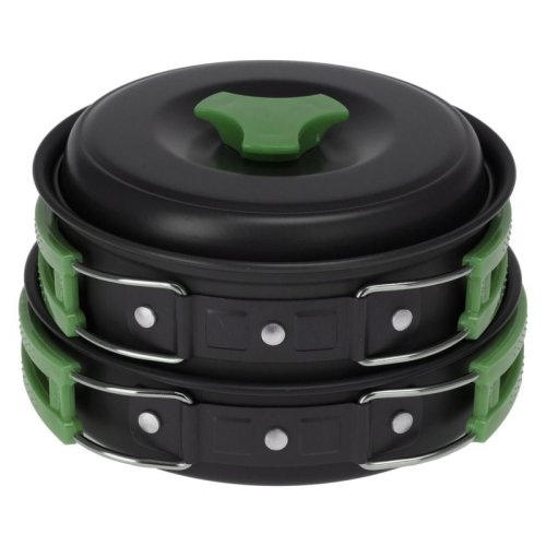 sada kastrolů, eloxovaný hliník s nerezovými úchyty 201, sada 2ks: 1x kastrol s poklicí (14x14x7cm), 1x kastrol (15x15x4cm), se sklopnými úchyty v zelené barvě, balení sady v černém pouzdře