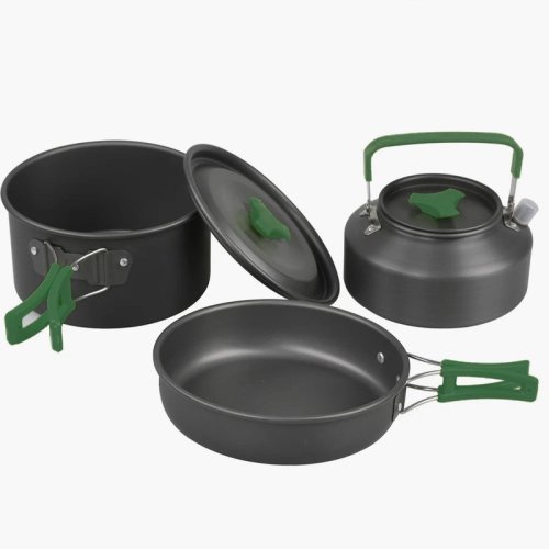 sada kastrolů, eloxovaný hliník s rukojeťmi z nerezové oceli 201, sada 3ks: pánev s poklicí (178x90mm), pánev (180x43mm), konvice s poklicí (151x75mm, 1000ml), skládací rukojeť v zelené barvě, sada balená v černém pouzdře
