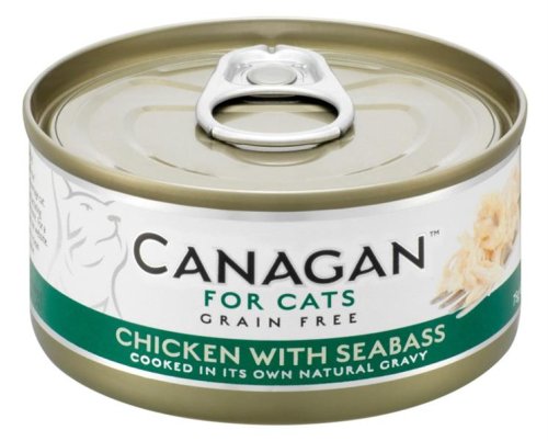 Canagan Cat Chicken with Seabass – je kompletní krmivo pro kočky. Vyrobené je z čerstvého kuřecího masa bez kůže. Kuře doplňují lahodná sousta masa z mořského vlka – vše šetrně vařené ve vlastní šťávě pro zachování vysoké výživové hodnoty krmiva. Stejně jako v ostatních výrobcích značky Canagan, ani v těchto konzervách pro kočky nenajdete žádné obiloviny. Konzervu můžete Vaší kočce podávat samostatně nebo v kombinaci s granulemi, nezapomeňte však upravit podávané množství. Složení: Kuřecí prsa (58 %), kuřecí vývar (32 %), mořský vlk (5 %), maniok, slunečnicový olej, vitamíny a minerály. Nutriční doplň.látky (kg): taurin 648,2 mg, trikalcium fosfát 4078 mg, síran zinečnatý 227 mg, cholin chlorid 1037 mg, síran železnatý 55 mg, vitamin A 10370 m.j., jodid draselný 6,5 mg, síran manganatý 6,5 mg, síran měďnatý 6,5 mg, vitamin D3 1944 m.j. Analytické složky: Vlhkost 77 %, hrubý protein 19 %, obsah tuku 1,2 %, hrubý popel 1,1 %, hrubá vláknina 0,03 %. Dávkování: 2-3 konzervy jsou optimální pro průměrnou kočku. Koťata, březí a kojící kočky mohou potřebovat více krmiva. Doporučené krmné dávky jsou pouze orientační, podávané množství krmiva je třeba přizpůsobit věku, aktivitě, prostředí i kondici vaší kočky. Kočka musí mít vždy přístup k čisté a čerstvé vodě.