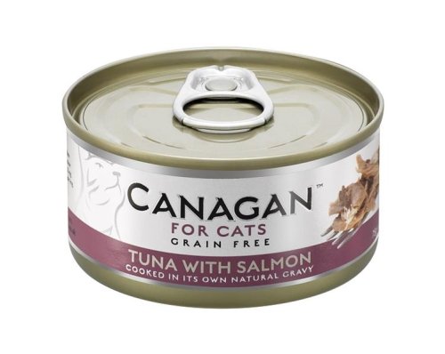 Canagan Cat Tuna with Salmon – je kompletní krmivo pro kočky. Vyrobené je z masa z tuňáků, kteří jsou volně lovení metodou šetrného odchytu na udici. Tuňáka doplňují lahodné kousky lososa - vše je šetrně vařené ve vlastní šťávě pro zachování vysoké výživové hodnoty krmiva. Stejně jako v ostatních výrobcích značky Canagan, ani v těchto konzervách pro kočky nenajdete žádné obiloviny. Konzervu můžete Vaší kočce podávat samostatně nebo v kombinaci s granulemi, nezapomeňte však upravit podávané množství. Složení: Maso z tuňáka (58 %), vývar z tuňáka (32 %), losos (5 %), maniok, slunečnicový olej, vitamíny a minerály. Nutriční doplň.látky (kg): taurin 646 mg, trikalcium fosfát 4078 mg, síran zinečnatý 323 mg, cholin chlorid 582 mg, síran železnatý 55 mg, vitamin A 10338 m.j., jodid draselný 7 mg, síran manganatý 7 mg, síran měďnatý 7 mg, vitamin D3 1938 m.j. Analytické složky: Vlhkost 77 %, hrubý protein 18 %, obsah tuku 2 %, hrubý popel 1,5 %, hrubá vláknina 0,1 %. Dávkování: 2-3 konzervy jsou optimální pro průměrnou kočku. Koťata, březí a kojící kočky mohou potřebovat více krmiva. Doporučené krmné dávky jsou pouze orientační, podávané množství krmiva je třeba přizpůsobit věku, aktivitě, prostředí i kondici vaší kočky. Kočka musí mít vždy přístup k čisté a čerstvé vodě.