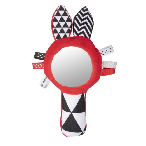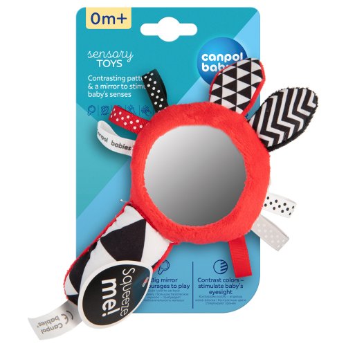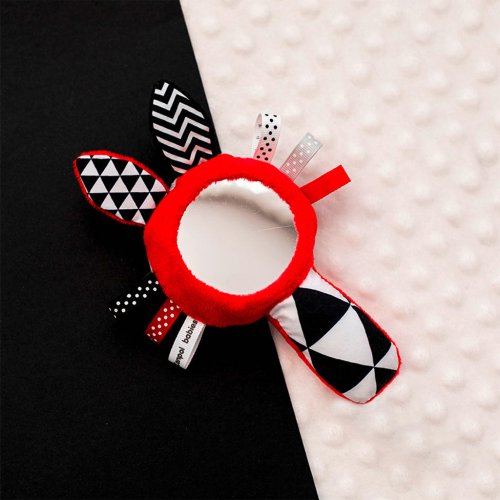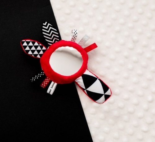 Kontrastní pískací činka se zrcátkem SENSORY. Díky praktickému tvaru lze hračku jednoduše uchopit. Činka disponuje pískacími elementy, zrcátkem a látkovými stužkami. Senzorické barvy stimulují rozvoj smyslů dítěte.